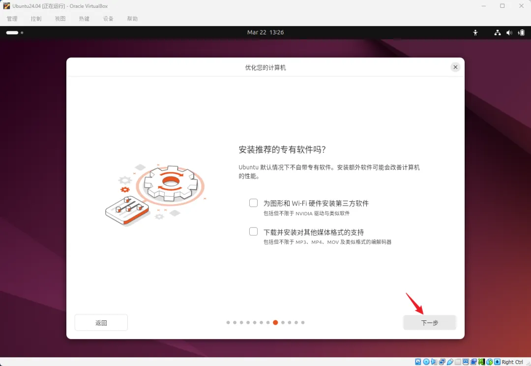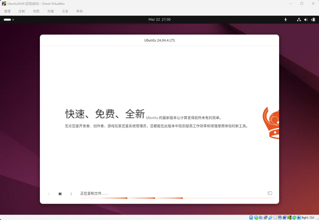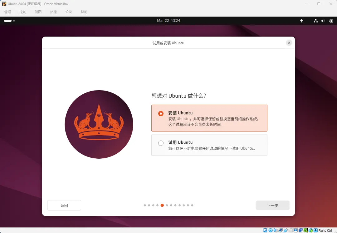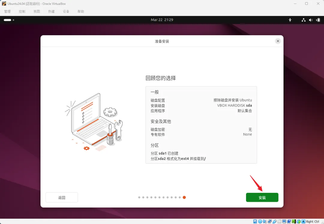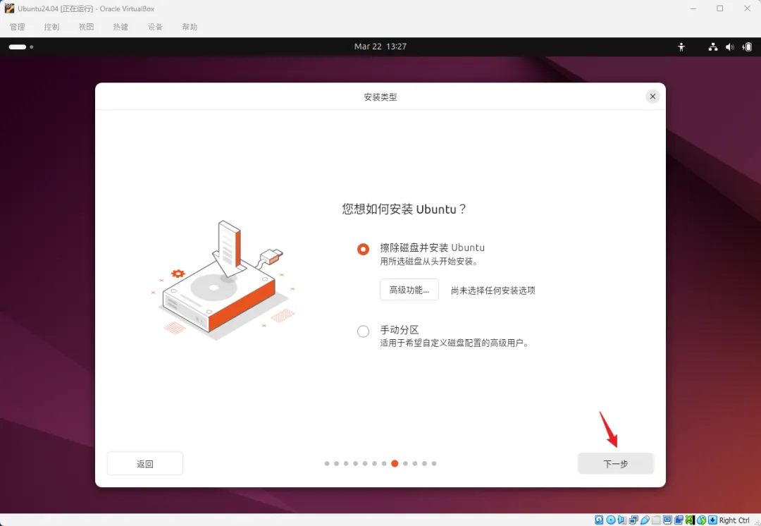• 安装类型选"擦除磁盘并安装Ubuntu"(别怕,擦的是虚拟硬盘,不是你真硬盘)
