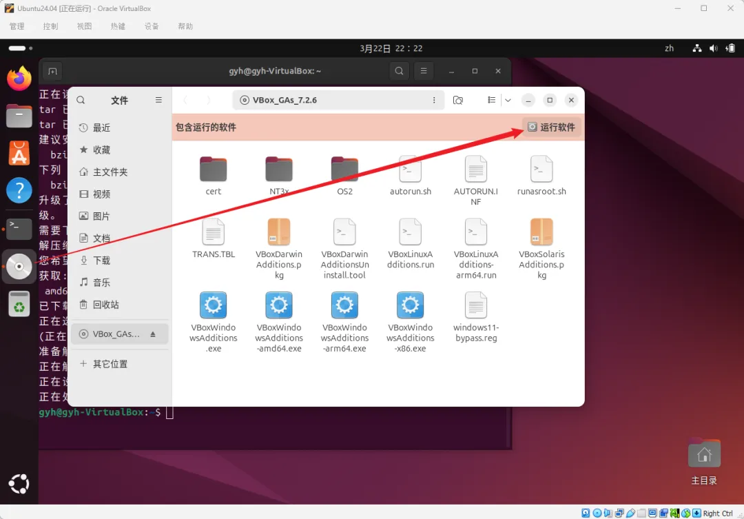第三步:点击 设备 → 安装增强功能。这时候桌面侧边栏会多出一个光盘图标,点开它,点右上角的"运行软件"按钮。