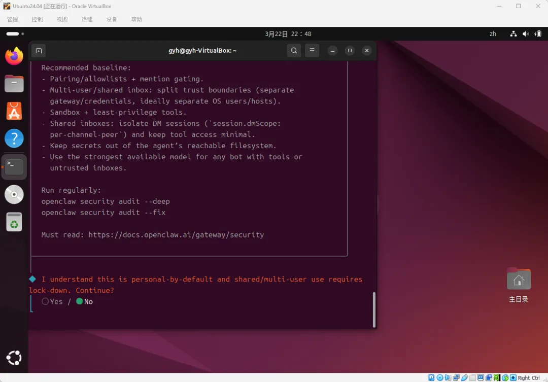 “我理解这个默认是个人使用的,如果要用在多用户/共享环境,需要进行安全加固。继续吗?”
