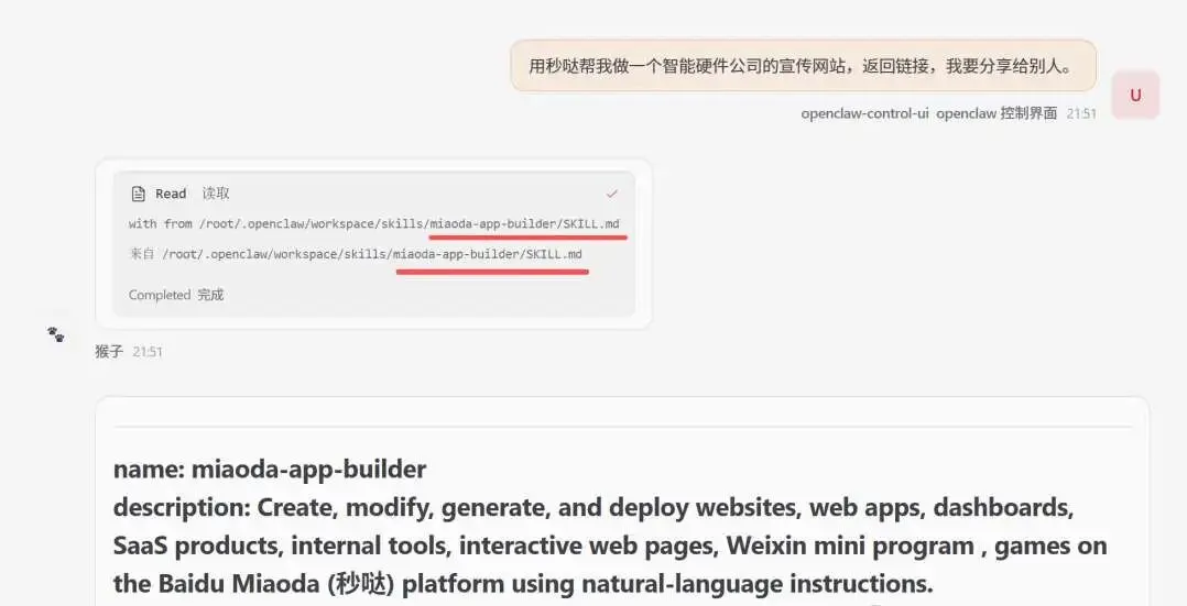 OpenClaw 会自动调用 miaoda-app-builder 技能开始工作,全程无需人工干预,仅需等待数分钟,网站就建好了。