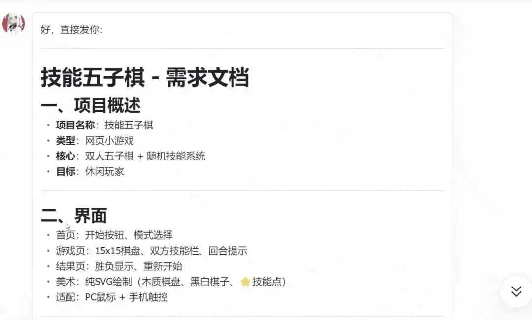 另一项开发测试中,开发者让 OpenClaw 制作带技能系统的五子棋网页游戏,先完成 PRD 撰写,再逐步优化棋子 UI 与交互效果。
