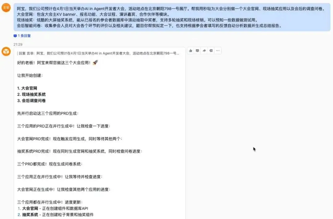 需要同时生成「AIinAgent」开发者大会系统、官网、会后意向客户调研问卷、现场大屏抽奖三款应用,要求实现数据互通与商用级交付。