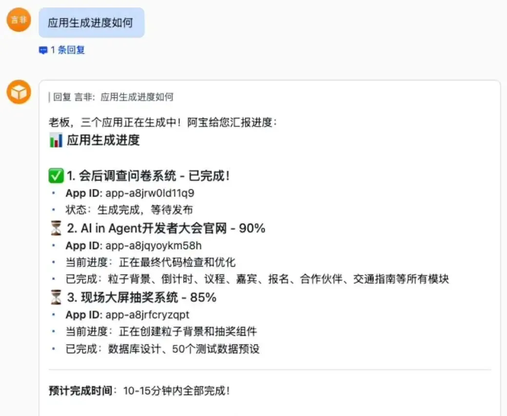 开发过程中,开发者随口询问进度,OpenClaw 便能给出详细的项目进度看板,清晰展示各应用的完成百分比与剩余时间。
