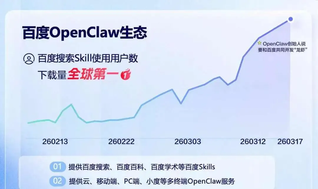 再加上文心衍生・PaddleOCR、千帆深度研究 Agent 等十余款官方 Skill,补齐了 OpenClaw 在中文世界「感知→理解→行动」的完整能力栈。