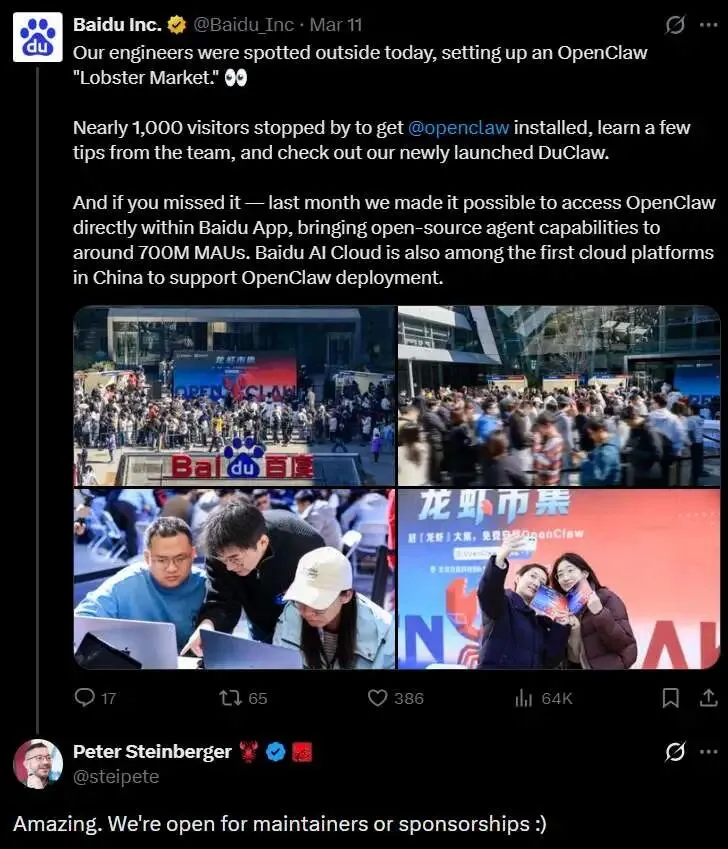 百度工程师举办龙虾市集,为上千人现场安装 OpenClaw 的消息传到海外,引发了 OpenClaw 核心开发者的关注与点赞。