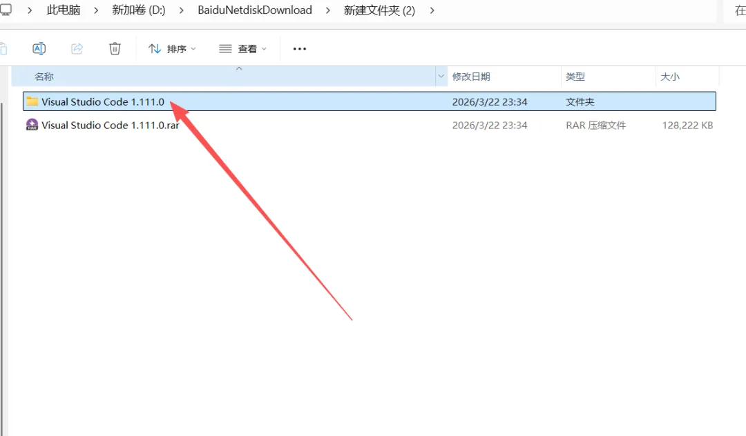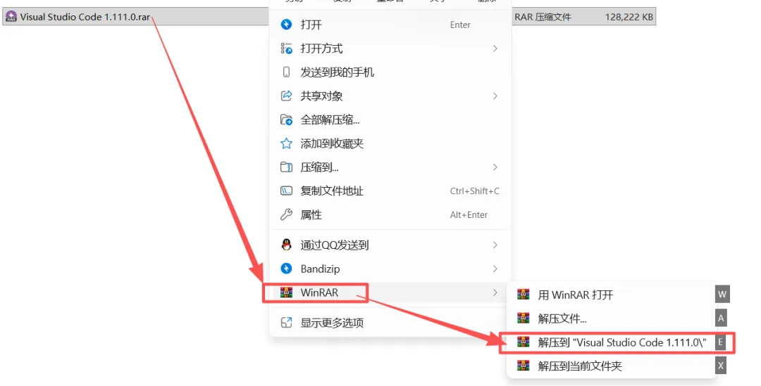 1.鼠标右击【Visual Studio Code 1.111.0】,选择【解压到Visual Studio Code 1.111.0】。