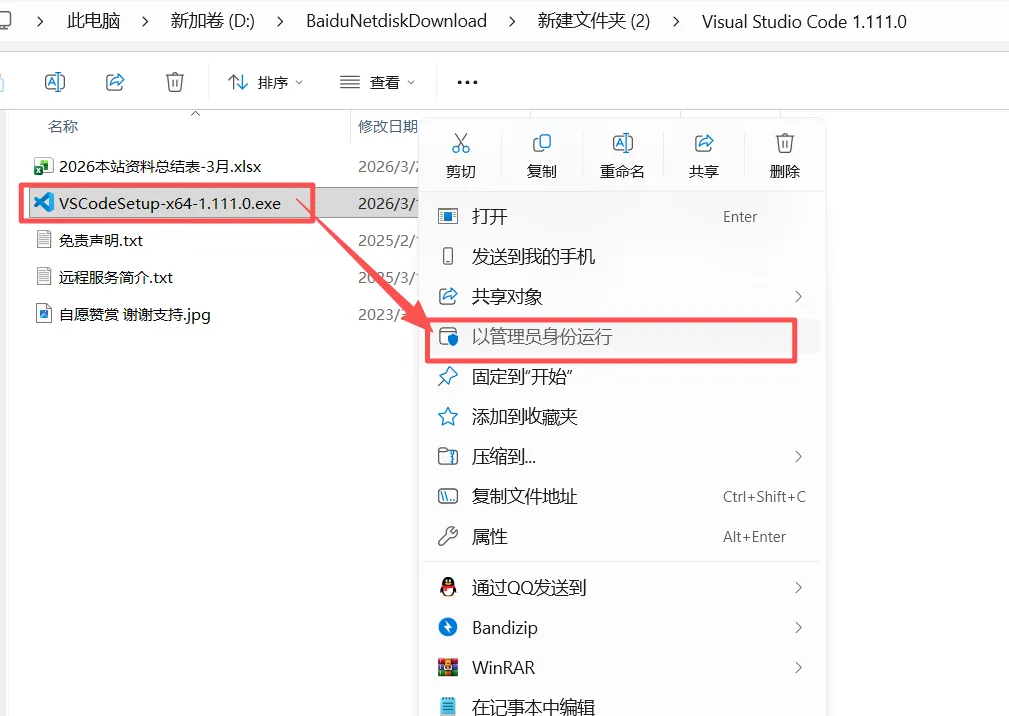 2.双击进入【Visual Studio Code 1.111.0】文件夹,右击【VSCodeSetup-x64-1.111.0】,选择【以管理员身份运行】。