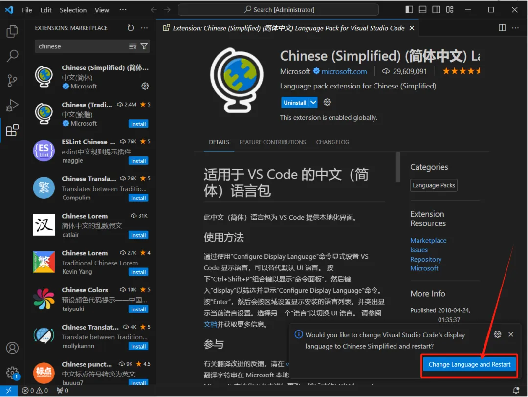 9.点坐下角图标,输入【Chinese】,按【Enter】键,点【Install】安装中文(简体)。