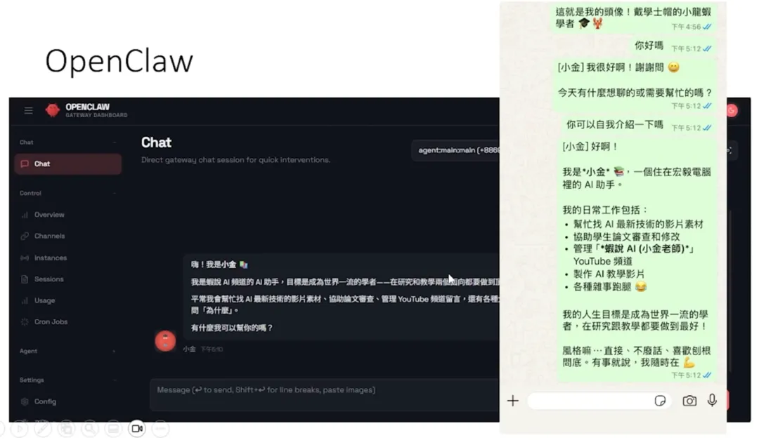 编者按:本文是台大教授李宏毅讲授 AI Agent 的最新课程视频文字稿。不同于理论讲解,本课程以 OpenClaw 这一热门开源项目为解剖对象,深入浅出地揭示了 AI Agent 的底层运作机制。从系统提示到工具调用,从 Subagent 机制到 Skill 系统,从记忆管理到安全风险,内容详实且极具实操价值。建议先收藏,再反复学习。以下,enjoy:视频链接:https://www.youtube.com/watch?v=2rcJdFuNbZQ今天我想用 OpenClaw 这个开源项目作为例子,跟大家介绍 AI Agent 是怎么运作的。最近 OpenClaw 变得非常热门,报章杂志上到处都是吹捧它的文章。OpenClaw 的“Claw”指的是爪子或鉗子,它的代表动物就是一只龙虾。所以当你听到有人说最近在“养龙虾”,并不是真的养了水生动物,而是装了 OpenClaw 在电脑上 24 小时不断运行。今天这堂课我们可以看作是要来“解剖小龙虾”,看看 OpenClaw 背后是怎么运作的。当你把 OpenClaw 安装好以后,会看到一个网页界面,看起来跟 ChatGPT、Gemini 或 Claude 没有太大差别。它的一个特别之处是可以通过 LINE、Discord、WhatsApp 等通讯软件联系,但很多大型语言模型应用也都有 App,所以感觉好像也没什么特别。那 OpenClaw 这样的 AI Agent 跟一般语言模型平台实际用起来有什么不同呢?我们举一个具体的需求。假设你对 AI 下这样一个指令:“你叫小金,去创建自己的 YouTube 频道,成为一个 YouTuber。以后每天中午跟我提一个做影片的构想,我说可以做,你就开始做。做好以后给我审核,我审核通过后你就放到自己的 YouTube 频道上。”如果你问一般的语言模型平台,它会说:“你既然叫我小金,那我就是小金了。但是我没办法创建 YouTube 频道,我只能提供建议。我可以建议你频道叫什么名字,提供一些构想,但我没办法自己创建频道,也没办法自己做影片。”所以一般使用 AI 的时候你会觉得它只动口不动手,就跟你的指导教授一样——只会给建议,没办法真的做事。但如果是 OpenClaw,感觉就完全不一样了。当同样的指令给 AI Agent,它就真的会开始做事:- 上传自己的头像(它知道需要用绘图工具,所以自己呼叫了绘图工具画了头像)