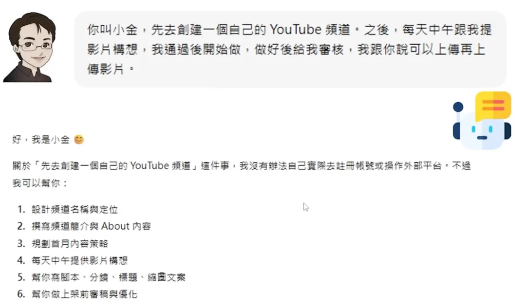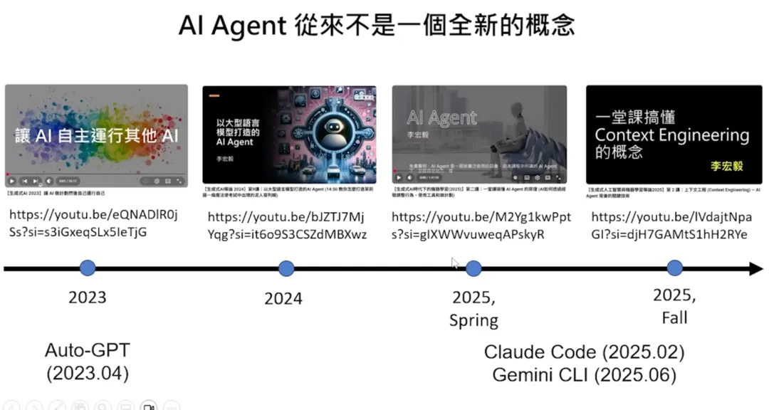 这就是小金的频道“瞎说 AI”。本来它给自己取名“小金老师”,但 YouTube 上太多人叫这个名字了,我让它取个容易搜寻的名字,它就自己改成了“瞎说 AI”。AI Agent 从来不是一个全新的概念,它是人类长期以来的梦想——希望有一个可以自主运行的 AI。早在 2022 年底有了大型语言模型后,人类就对自主运行的 AI Agent 有了期待。2023 年就有了很知名的 AI Agent 框架 AutoGPT,当时新闻也炒得非常火热。但大家实际装起来后发现没那么好用,热潮就淡掉了。那是因为当时语言模型能力比较不行。随着语言模型每一次能力变强,就会有一波 AI Agent 浪潮:- 2023 年,我们在机器学习课程讲过一次 AI Agent