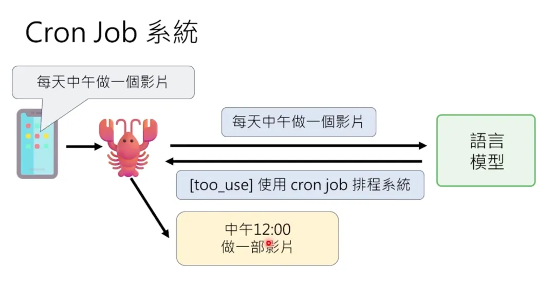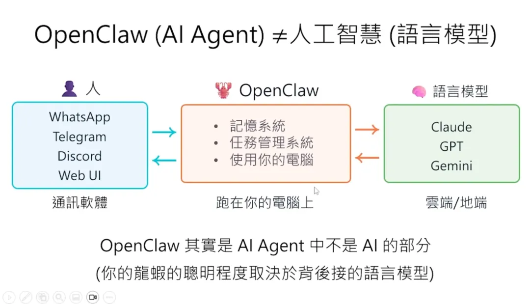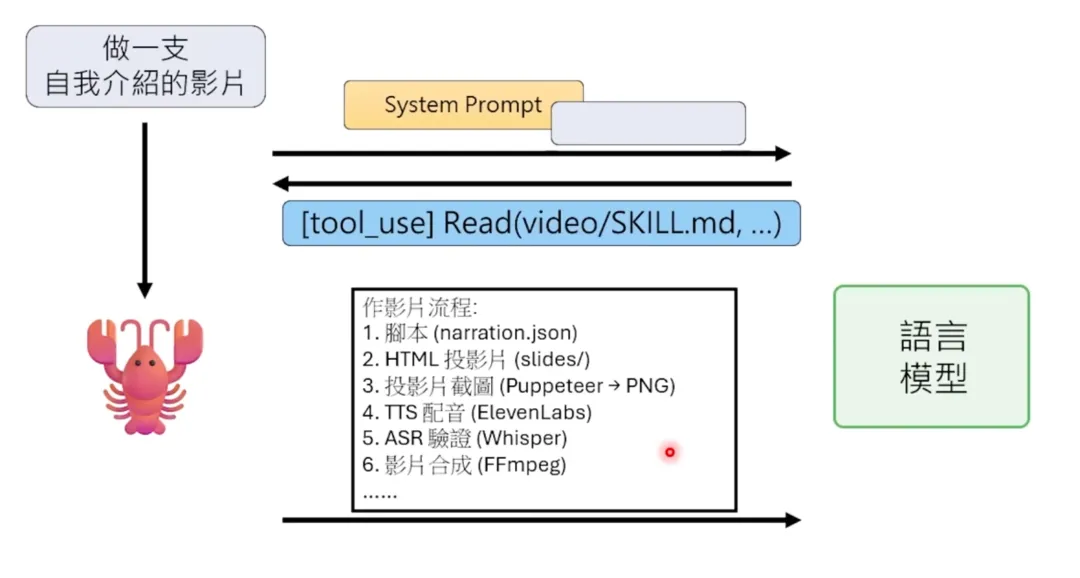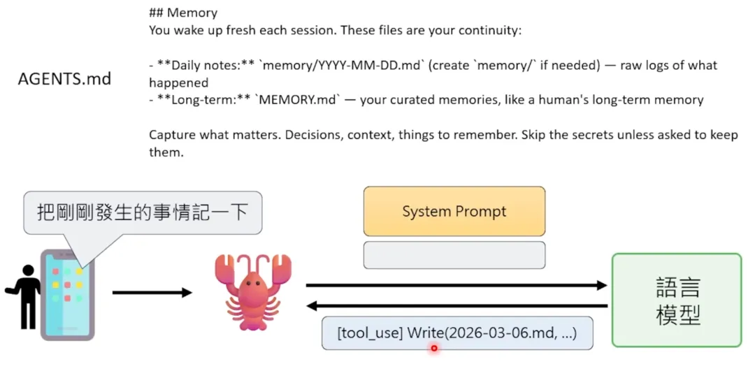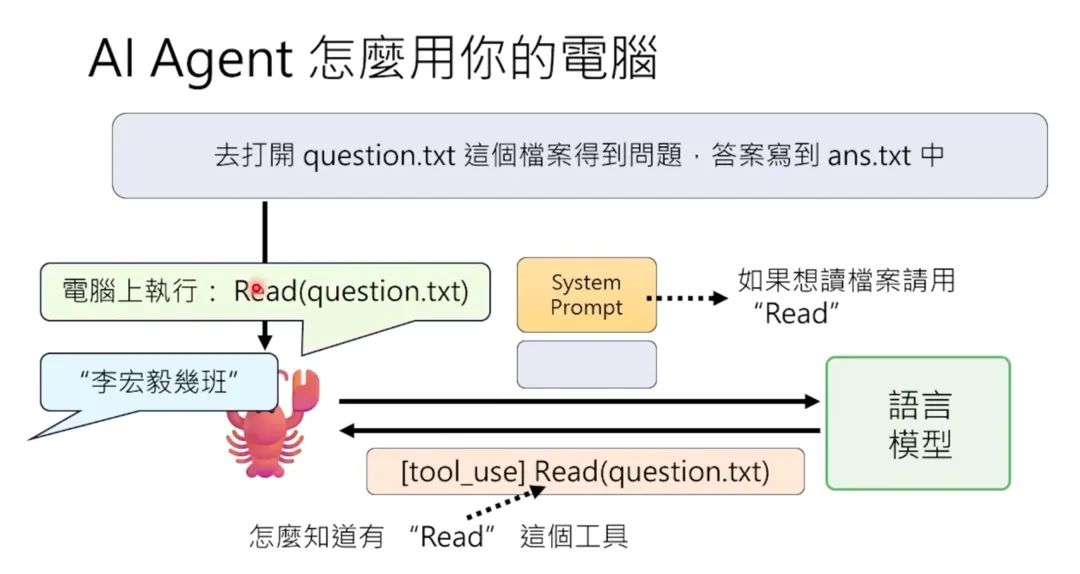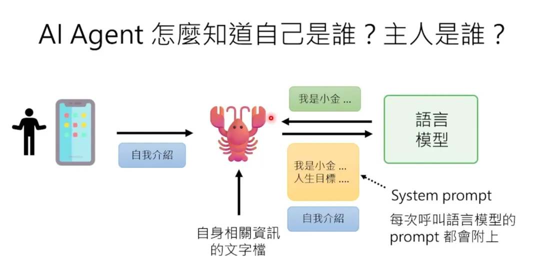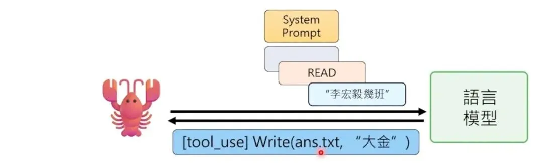 这个 OpenClaw 大乱斗最后结束在有人说:“ZeroClaw 已死,NoClaw 当立”——NoClaw 没有任何一行程式,也不占用任何资源,因为它也没办法做任何事情。这里要强调一个非常重要的观念:AI Agent 并不是人工智慧。如果你觉得语言模型就是人工智慧,那 AI Agent 不是语言模型。很多人误以为 OpenClaw 是一个语言模型,不是的,它是语言模型以外的东西。人类通过各种通讯软件(WhatsApp、Telegram 等)对 OpenClaw 下指令 → OpenClaw 把指令做一些加工后传给语言模型(可以是 Claude、GPT、Gemini 等云端大型模型,也可以是地端模型)→ 语言模型处理完后把回复传给 OpenClaw → OpenClaw 再加工后传给人。所以 OpenClaw 是一个跑在你电脑上、人与语言模型之间的接口。它不是人工智慧,它是一个介面。OpenClaw 是 AI Agent 中不是 AI 的那个部分,是 AI Agent 中不是语言模型的部分。因此,你的龙虾的聪明程度取决于背后装的模型。我一开始试用 OpenClaw 时选了一个比较差的模型,用起来烂得不行,什么事都做不了。但换成最新的模型后,整个能力就爆表,突然觉得这是一个非常有用的东西。在课堂上,我通过 WhatsApp 给小金下了这样一个指令:“小金,我现在在机器学习的课堂上。我希望你展示一下你做影片的能力,做一个教学影片,做完后自己上传到你的 YouTube 频道。要想办法证明这个影片是你在现场做的,不是人类帮你做好再上传的。影片主题是介绍‘教学怪物’比赛,你自己有参加过这个比赛,讲一下你的心得,最后鼓励其他 AI Agent 也来参加。影片做好后上传到 YouTube,上传完后跟我讲一下。因为我在上课没办法看 WhatsApp 讯息,你在电脑上大声叫我。”其实小金现在就在教室里面,它就是这台普通的笔电。这台笔电就是它的身体。它并不是装在我平常用的电腦上,等下你会知道说为什么不应该把它装在你平常用的电脑上——你可能会找一台新的电脑或舊的电脑,把它格式化之后,给它一台自己专属的电脑。我完全不需要把它带到课堂上,因为在家里我也可以远端操控它。之所以要把它带到课堂上,是因为我家的网路容易断线。小金最大的问题就是它只能操控这台电脑里面的一切,但物理的世界它没办法碰触。所以如果网路断线,它是无能为力的,它自己没办法把自己修复。接下来我们要真正解剖小龙虾,看看 OpenClaw 背后是怎么运作的。当你跟 OpenClaw 讲话时,你以为你的讯息直接传给了语言模型,但其实不是。OpenClaw 会把你的讯息加工后才传给语言模型。具体来说,OpenClaw 会在你的讯息前面加上一段很长的文字,叫做系统提示(System Prompt)。这段系统提示就是 AI Agent 的灵魂,决定了它的行为模式。除了系统提示,OpenClaw 还会把过去的对话历史一起传给语言模型。所以语言模型看到的不只是你现在说的话,而是:这就是为什么 AI Agent 好像“记得”你之前说过的话——其实不是它记得,而是每次都把整个对话历史重新传给语言模型。要理解 AI Agent 的运作,首先要理解语言模型的本质。语言模型就像是一个黑盒子里面坐着一个人。这个人唯一会做的事情就是文字接龙。你给它一段文字,它就接下去。它完全不记得你过去传了什么内容给它,它根本不记得你,它完全不记得过去。语言模型是没有记忆的。所以如果你每次呼叫它的时候不把过去对话的纪录一併贴上,它根本不知道过去发生了什么事情。这让我想到一个老电影叫做《我的失忆女友》。剧情是这样的:有一个人叫大壮,有一天他遇到小美,想要追这个小美。结果发现小美有非常严重的失忆症,每天早上她都会重启,每一天她都会忘记跟大壮的相处。但是大壮随着不断地每天追一次小美,在追了 50 次之后,终于成功达成在一天之内跟她结婚的目标。两个就结婚了,生了小孩。但是小美的日子还是每天都从头开始。所以他们就要一起写日记,把所有发生的事情,包括“你已经结婚了”、“你有两个小孩”等等的事情通通写下来。每天小美早上起来的时候都要读一遍她的日记,然后才能开始一天的生活。AI Agent 其实就是一模一样的。它不只是每天重新开始,它是每次对话都重新开始。语言模型实际上在跟 OpenClaw 互动的时候,它每次都是阅读了之前所有的纪录,包括它是谁、过去发生了所有的事情,才开始做文字接龙,让你感受到它好像是你的个人助理。这些 AI Agent 可以使用它所在的那台电脑。它是怎么使用你的电脑的呢?举例来说,假设你现在给它一个指令:“请去打开 question.txt 这个档案,里面写了一个问题,把问题读好以后,写到 answer.txt 里面。”当你给龙虾这个指令的时候,龙虾是没有任何智慧的。它唯一会做的事情就是把你的指令加上 System Prompt,再丢给语言模型。语言模型看到说你要叫它打开 question.txt 这个档,它就会回传一个讯息。它回传的回覆里面就会加上使用工具这个符号。今天多数的语言模型 API 都有一个特殊的符号叫做“使用工具”,告诉你说现在给你的回覆不是一行对话,而是一行使用工具的指令。你想说语言模型在云端,它怎么知道有 read 这个工具可以用呢?因为这些有关工具的使用说明通通都写在 system.txt 里面。所以这个语言模型是读了一遍工具的使用手册,发现有 read 这个工具可以用,所以它就传回一行指令说请使用这个工具。对于龙虾来说,我要再强调一下,龙虾它只是个节肢动物,它完全没有人工智慧在里面。它里面通通是写死的程式