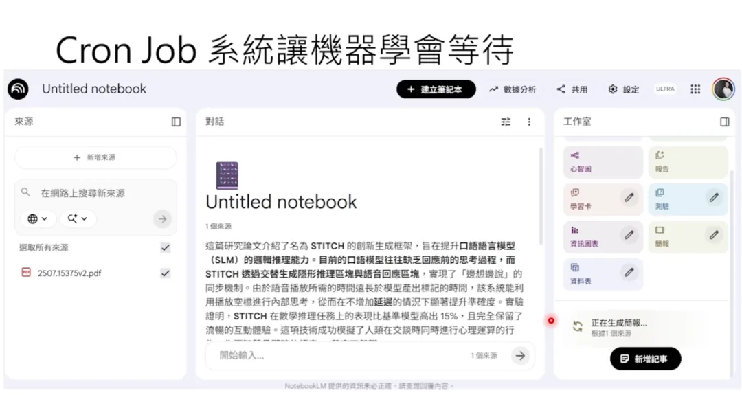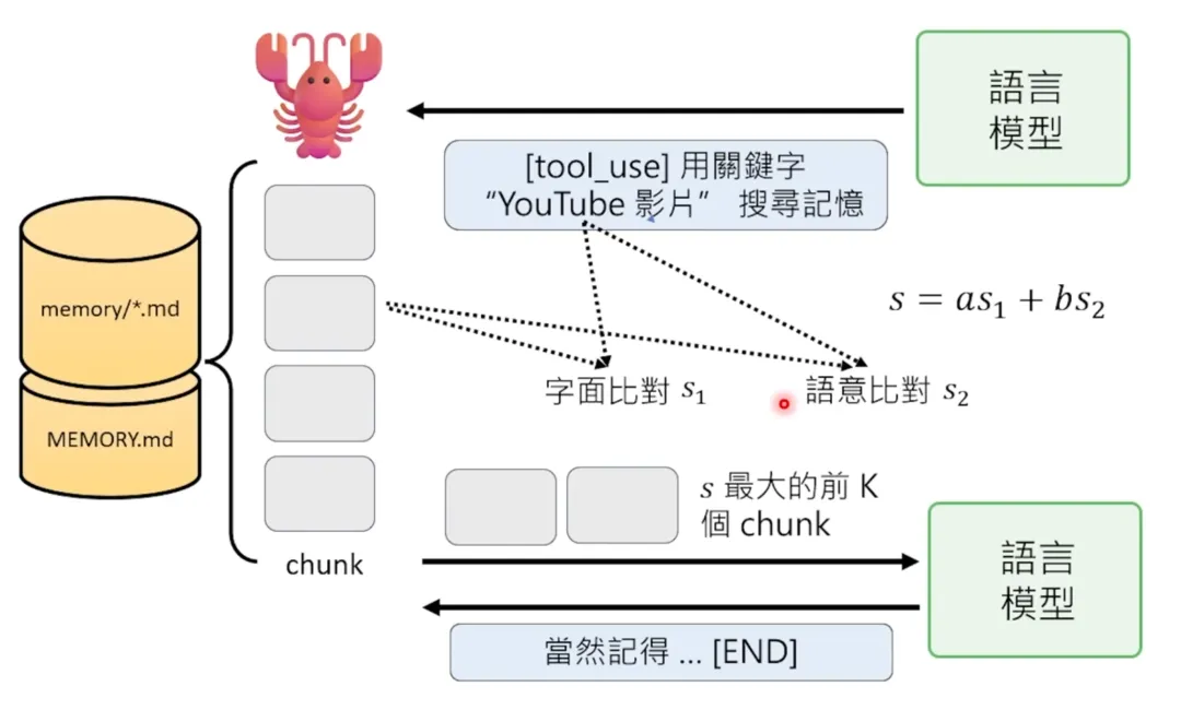 通过这种定时触发的机制,AI Agent 就能实现“主动”行为。我一开始设定小金每 30 分钟汇报一次,后来觉得太慢了,就跟它说:“以后每 15 分钟汇报一次。”它就真的把 habit.md 里面的设定改成 15 分钟。除了心跳机制,OpenClaw 还有 Cron Job 功能。当语言模型决定要在特定时间做某事时,它可以创建一个 Cron Job,比如:OpenClaw 会把这个任务记录下来,到了指定时间就自动触发。举个具体例子:我们能不能让小金去使用 NotebookLM?用一个 AI 去使用 AI,然后用 NotebookLM 来做影片呢?其实不是不可能,但用起来有点不方便。会有什么样的问题呢?小金完全有能力去打开一个网页,完全有能力去把一个档案上传到 NotebookLM。但是上传之后,NotebookLM 的执行是花时间的,它做个投影片通常要 3 到 5 分钟。它在右下角出现说“投影片正在生成”。但小金没有办法等啊。对它来说,它就是收到“投影片正在生成”,那只能回报主人说“投影片正在生成”,然后就结束了。它没有办法完成整个流程。如果今天你没有 Cron Job,但你想要让小金去操控某一个需要等待的事情,你得到的结果可能是这样:语言模型透过龙虾去做一堆开启网页、上传档案之类的事情,然后走到最后一步,龙虾回报语言模型说看到的画面上面写“投影片生成中”。对语言模型来说,它要怎么接龙?它可能就只能接“主人,投影片生成中”,然后就没有然后了。这个投影片并没有真的被下载下来。今天模型假设它可以操控 Cron Job,那它可以发现“投影片生成中”。如果这个语言模型够聪明,它也许就可以使用 Cron Job 的 Tool,然后在 Cron Job Tool 里面写说:“投影片还没生成完成,3 分钟之后再来检查。”然后就把 Cron Job 存起来。过 3 分钟之后,这个 Cron Job 会真的去戳这个龙虾,龙虾就发一个指令跟语言模型说:“请看一下 NotebookLM 的网页。”语言模型当然它并没有什么等待的概念,它并不是真的在等待。对它来说每次的对话都是重启。但它看到的就是有人叫它去检查 NotebookLM 的网页,检查发现出现下载的按钮了,然后就真的把投影片下载。所以如果有 Cron Job,可以让模型学会等待,让它做一些更复杂的操作。但我发现就算是我用比较好的模型,在使用 NotebookLM 下载投影片的过程中,也不是每次都会成功。它不是每次都会知道要设定 Cron Job。那怎么改变这件事情呢?其实就是直接改写 memory.md。我就直接在 memory.md 里面写说:“以后看到网页出现‘生成中’、‘下载中’这种字眼,就设定一个 3 分钟后的 Cron Job,3 分钟之后再来检查。”它就知道今天如果档案还没生成,等 3 分钟之后再来看。生成完以后,它就可以载下来。所以你就可以让 AI 去操控另外一个 AI,然后做更强大的事情。OpenClaw 的记忆系统非常简单,就是一堆.md 档案。当你打开 OpenClaw 的资料夹,你会看到很多.md 档案:这些档案都是纯文字档,你可以直接打开来看,也可以手动修改。但其实不太建议你手动修改。比如说我嘗試把小金的名字直接改成“大銀”,我就问它说“你叫什么名字”,它就觉得好困惑:“这边说是大銀,这边又突然说是小金,我到底叫什么名字?”它就会觉得非常困惑。所以你自己改的时候比较容易掛一漏萬。因为当你使用模型的时候,它其实会自主地把它的记忆存在各式各样的.md 档里面。你自己修改很容易掛一漏萬,还不如交给 AI Agent 来修改它背后的.md 档。当 memory.md 变得很长的时候,OpenClaw 不会把整个 memory.md 都塞进 System Prompt,因为这样会浪费太多 Context Window。它用的是 RAG(Retrieval-Augmented Generation)机制:- 分别算字面相似度 s1 和语义 embedding 相似度 s2