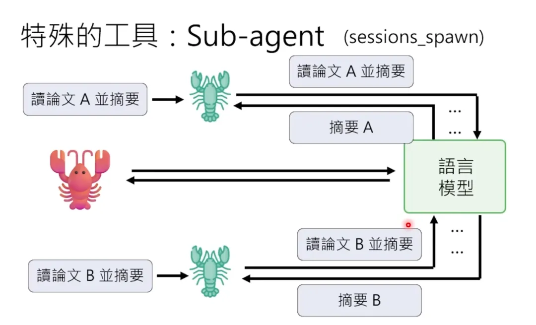 这样就可以节省 Context Window 的使用。这里要特别提醒:弱模型可能会说“已记住”,但实际上没有调工具写.md 档案,纯粹记了个寂寞。所以你要去检查.md 档案是否真的被改写了。如果没有被写进 memory.md,那就是假的记忆,下次对话就会忘记。接下来讲一个非常重要的机制,叫做 Subagent(子智能体)或 Spawn(繁殖)机制。当大龙虾遇到一个复杂的任务时,它可以“繁殖”出小龙虾,让小龙虾去处理子任务。这样做有什么好处呢?最主要的原因是节省 Context Window。假设你给大龙虾一个任务:“去网路上搜集 10 篇关于 AI Agent 的文章,然后摘要。”