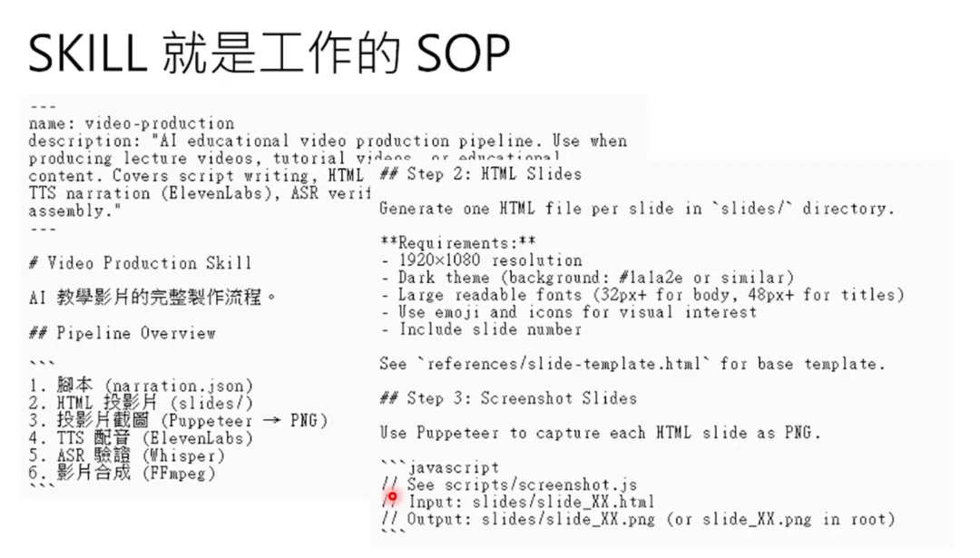 所有这些对话历史都会累积在大龙虾的 Context Window 里面,很快就会爆掉。大龙虾可以生出 10 只小龙虾,每只小龙虾负责处理一篇文章。每只小龙虾都有自己独立的 Context Window,它们各自去搜寻、读取、摘要文章。最后,每只小龙虾只回报一个摘要给大龙虾。大龙虾只看到 10 个摘要,而不是 10 篇完整文章的所有互动过程。这就是 Context Engineering 的核心概念:大龙虾只看摘要,不看子龙虾的完整交互过程。但这里有一个问题:如果每一个龙虾都觉得“这件事情就交给一个子代去做”,那就无穷无尽,最后层层外包,没有任何一个人做事。就像在大公司里面,老闆下一个命令,有一个大专案,一层一层地递下来,最后都只有一个苦命工程师、苦命工读生在做事,中间的人都只是传话的而已。这就让我想到 Rick & Morty 里面其中一集,这个怪物叫做 Mr. Meeseeks。它做的事情就是你只要按下这个 Meeseeks Box,就可以召唤出这个蓝色精灵。它可以帮你做一件事,做完之后就消失了。它就是个 Subagent。在 Rick & Morty 里面,其中一个角色就是一个废柴老爸叫做 Jerry。他就跟 Meeseeks 说:“请让我提升我打高尔夫球的能力。”就召唤出一个 Meeseeks 出来。然后 Meeseeks 发现 Jerry 太笨了,怎么教都没有办法进步。它发现它解决不了这个问题,怎么办?它自己也去按了这个 Meeseeks Box,就再召唤出另外一个 Mr. Meeseeks 出来。然后第二个 Mr. Meeseeks 也解决不了这个问题,它要召唤第三个。第三个召唤第四个,就无穷无尽,就召唤出一堆 Mr. Meeseeks,但还是没有人可以让 Jerry 变强。所以最后它们解决方法就是绑架了一堆人质,跟 Jerry 说:“如果你的高尔夫球技巧没有进步,就把这些人杀了。”最后在巨大的压力之下,Jerry 就突然进步了。所以对于这些龙虾来说,如果每个人都可以召唤小龙虾的话,那就没人可以做事了。所以虽然小龙虾也有那个工具,因为繁殖就是个工具,但是当语言模型跟小龙虾说“你去用这个工具”,OpenClaw 直接在它的程式端就禁止小龙虾使用这个工具。结束。OpenClaw 不要忘了,它是个六亲不认的程式。说没办法执行就是没办法执行,你没有办法透过 Prompt Injection 用说话的技巧来骗过它。最近大家可能常常在 AI Agent 相关的文献或新闻上听到 Skill 这个词彙。所谓的 Skill 它并不是一段程式,Skill 是工作的 SOP,是工作的流程。比如说小金它有一个做影片的 Skill。这些 Skill 可以是龙虾自己生成的。你就跟它讲说:“回忆一下怎么做一支影片,把它写成 Skill,免得以后忘了。”它就把做影片的流程写成 Skill。所以Skill 就是龙虾的 SOP,免得它复杂的工作中间有几步忘了,最终没有办法完成。比如说这个是小金背后的产生影片的 Skill。怎么产生影片呢?对它来说就是: