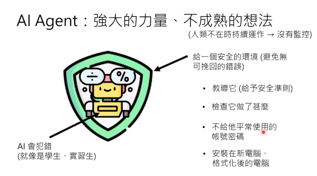 - 给它专属的电脑:你可能会想说你没有给它帐号密码,但也许你的帐号密码偷偷存在你的电脑的某个角落。当你今天把 AI agent 装到某一台电脑上的时候,你就要有一个概念是这台电脑就是它的,它想要做什么就做什么,这台电脑上所有的东西它想找都能够找得到。所以最好不要把它装在你平常使用的电脑上面。你可以装在一台新电脑上面,或格式化一台舊电脑,把它装在一个格式化的电脑上面。