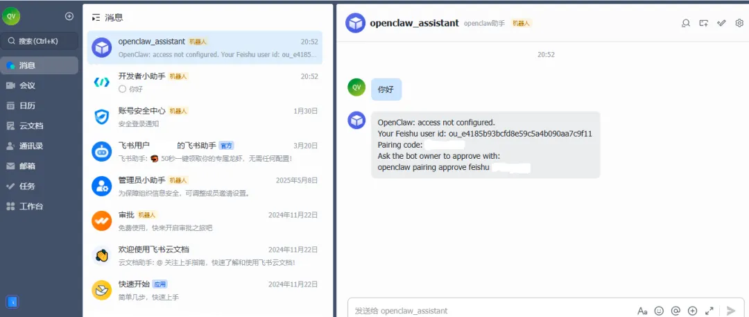 在飞书中找到创建的机器人进行对话进行测试,首次对话会返回一个配对码。需要在Ubuntu终端执行如下命令与OpenClaw进行配对:
