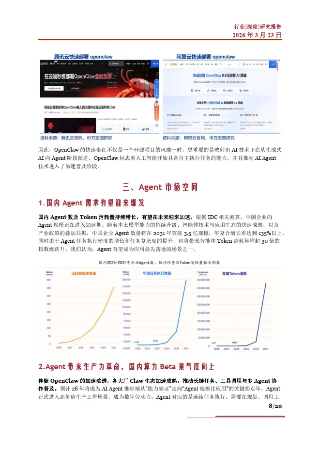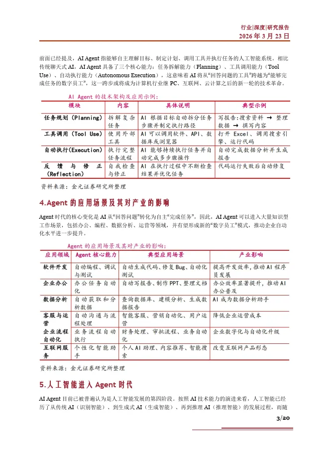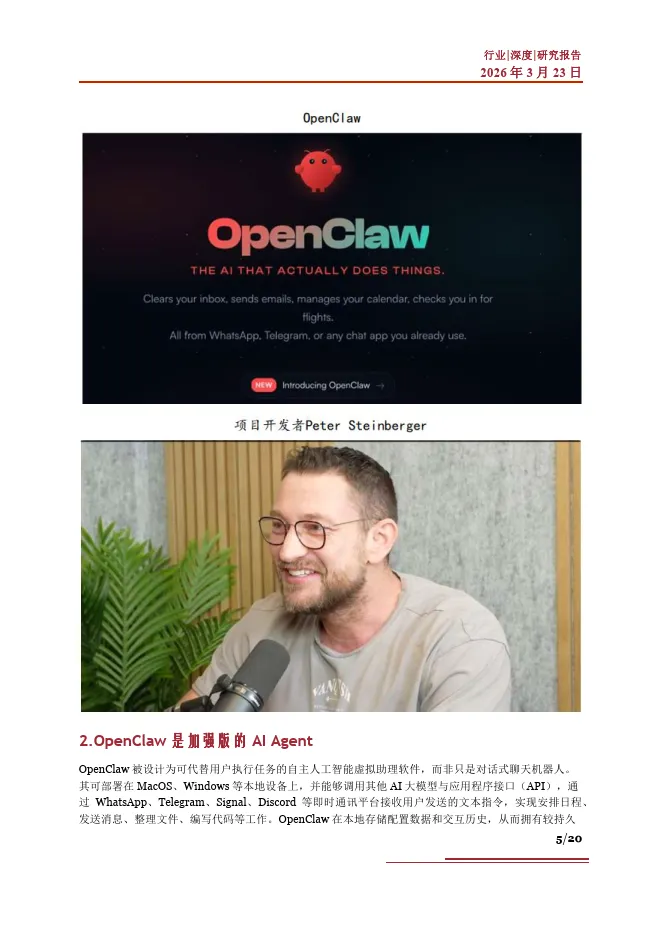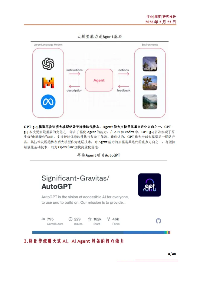 围绕AI Agent 智能体行业,下面我们从其核心能力、应用场景、市场空间等方面展开研究,对当前爆火的Agent 应用项目OpenClaw 进行详细分析,并对对产业链、受益环节及相关公司进行梳理,希望帮助大家更多了解AI Agent 智能体行业发展情况。