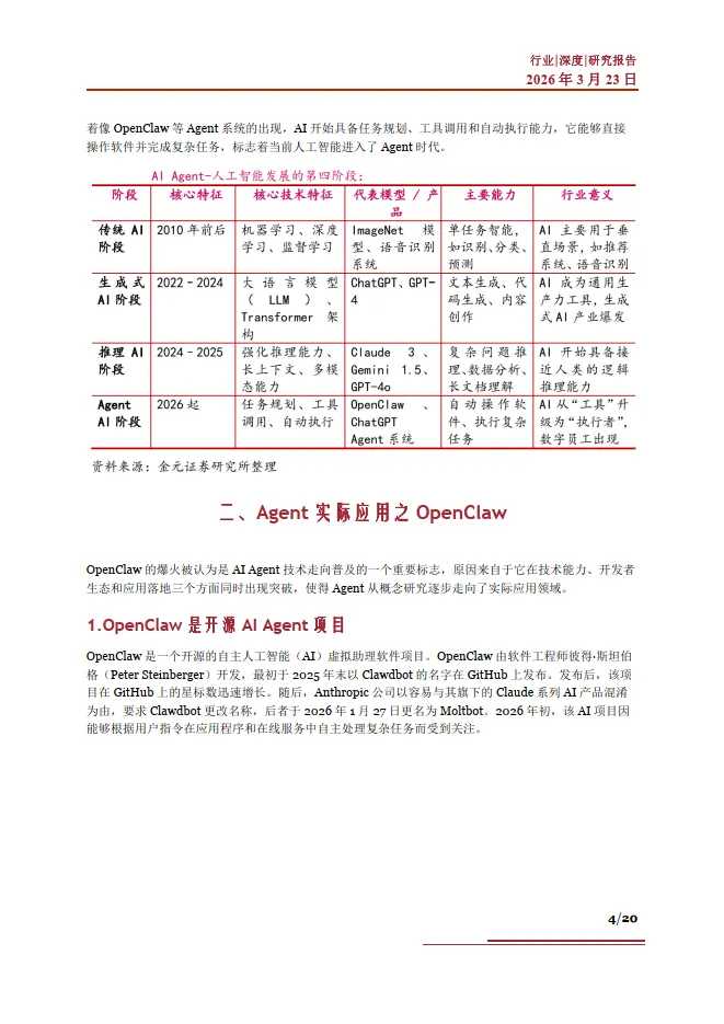 AI Agent(人工智能代理/智能体)是指能够自主理解目标、制定计划、调用工具并执行任务的人工智能系统。OpenClaw 的爆火被认为是AI Agent 技术走向普及的一个重要标志,原因来自于它在技术能力、开发者生态和应用落地三个方面同时出现突破,使得Agent 从概念研究逐步走向了实际应用领域。