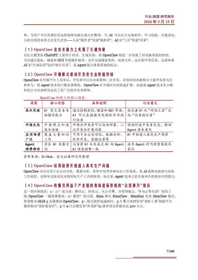 大模型能力是Agent 基石。AI Agent 本质是一种基于大模型能力之上开发出的平台型产品,面向chatBot 之外与用户设备及数据交互的场景。在OpenClaw 推出及火爆之前,即存在各类AI Agent 相关项目,但其在当下爆发,大模型能力的提升是其背后的主要原因之一。