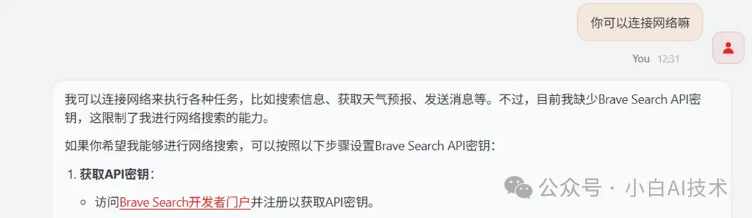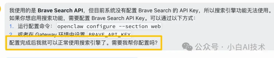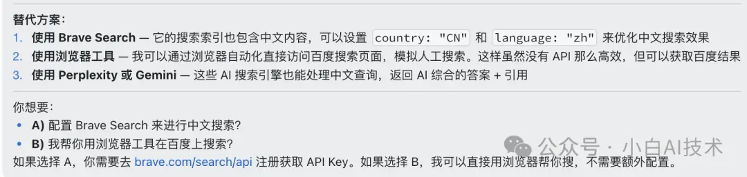 它内置的搜索方式是Brave Search API,但这玩意儿在国内……嗯,你懂的,基本用不了。没有API Key,它就没法通过搜索引擎抓取资料。