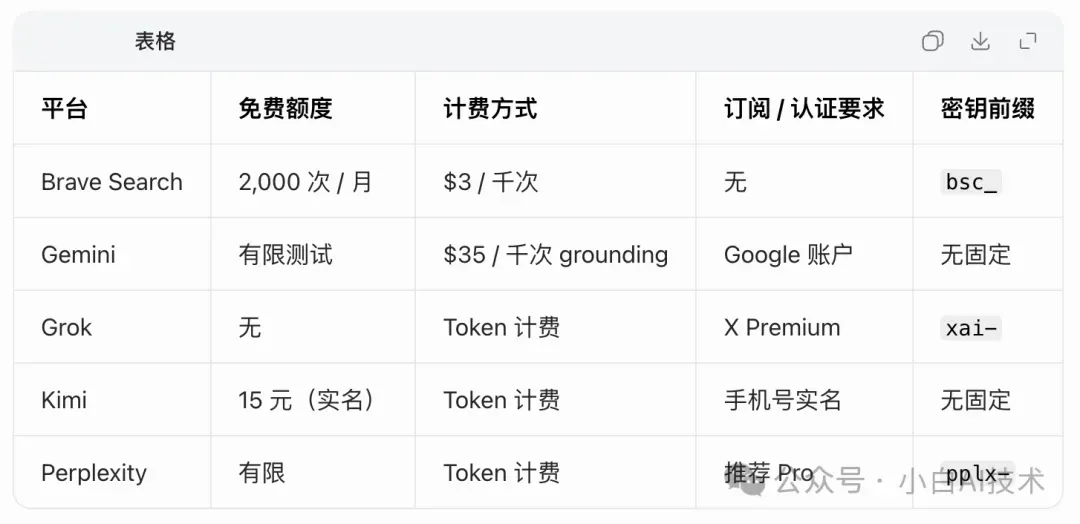 小白查了一圈,OpenClaw官方文档里列出的搜索引擎只有这5个: