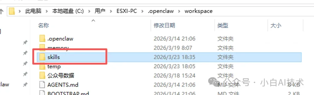 在这个文件夹里,新建一个叫【skills】的文件夹(如果已经有了就不用建)