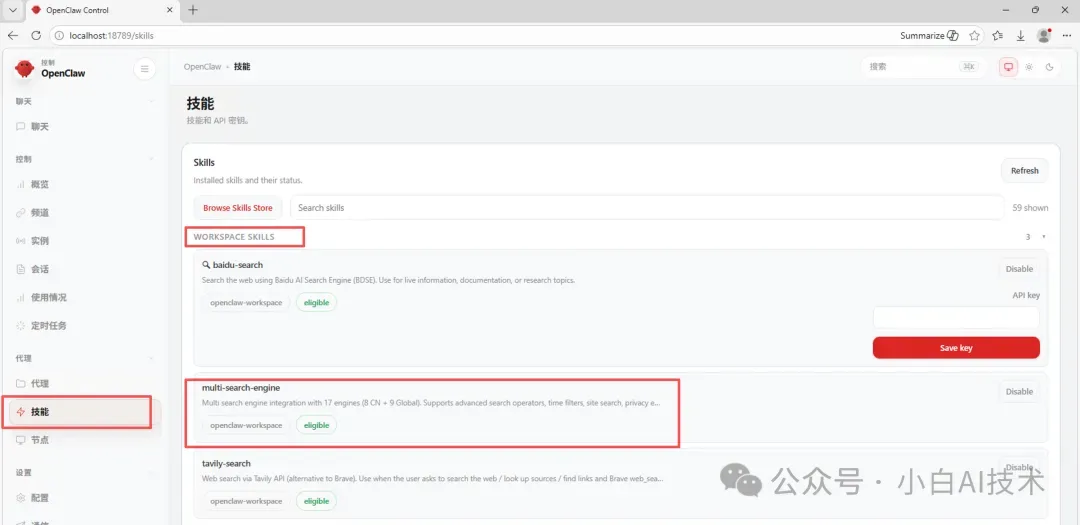 打开浏览器,访问【http://localhost:18789】点击页面上的【技能】,找到【WorkSpace】,点开就能看到你刚装的Skill了