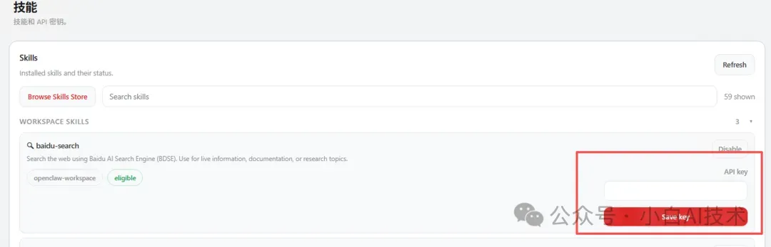 大部分Skill装上就能用,但有些Skill还需要你提供对应平台的API Key。
