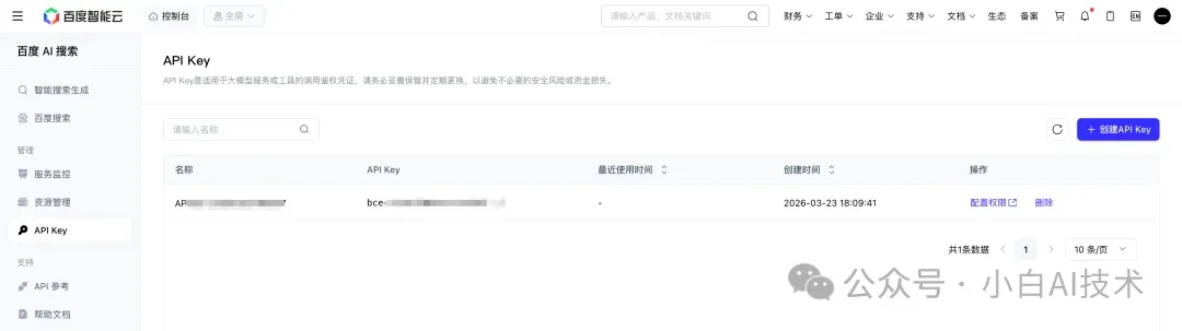 比如你想装“百度搜索”的Skill,就需要去百度千帆申请API:
