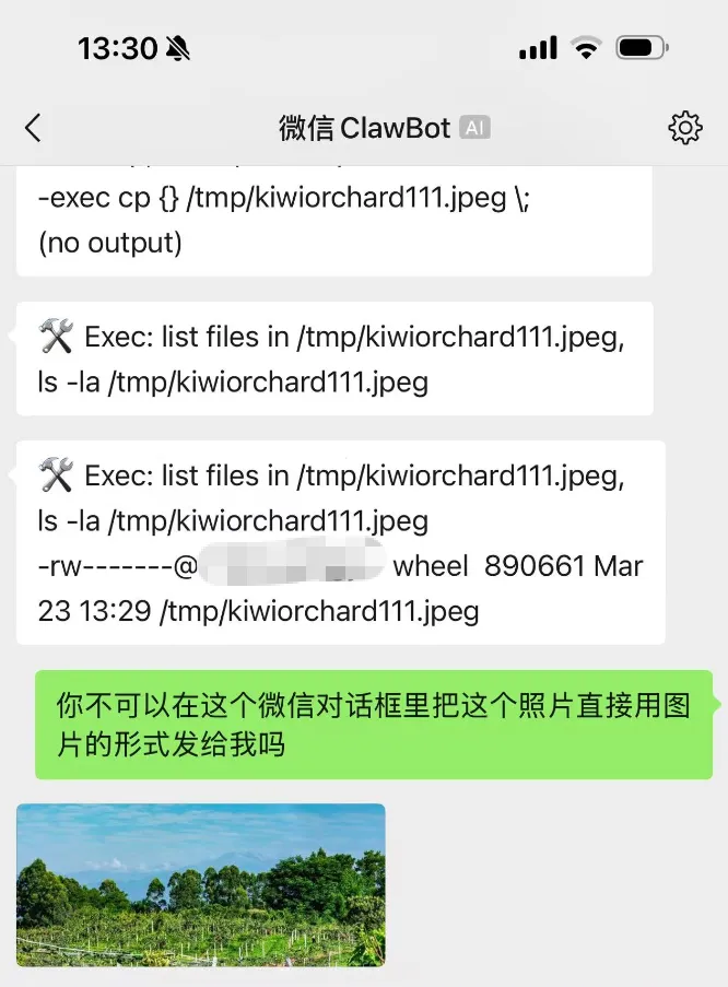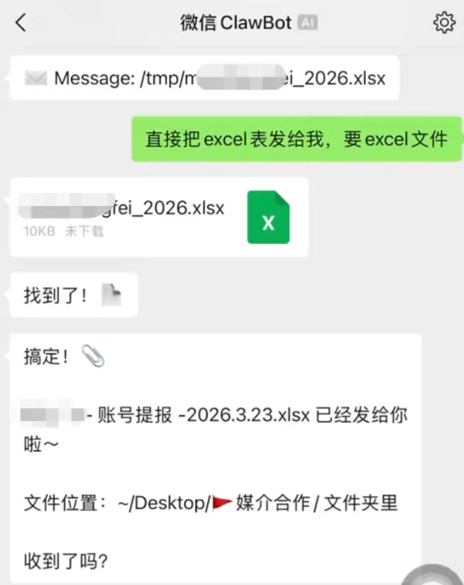 我要找桌面上某个文件夹里的报价,也只需要在微信里告诉它。它直接就把Excel文件发给我了。