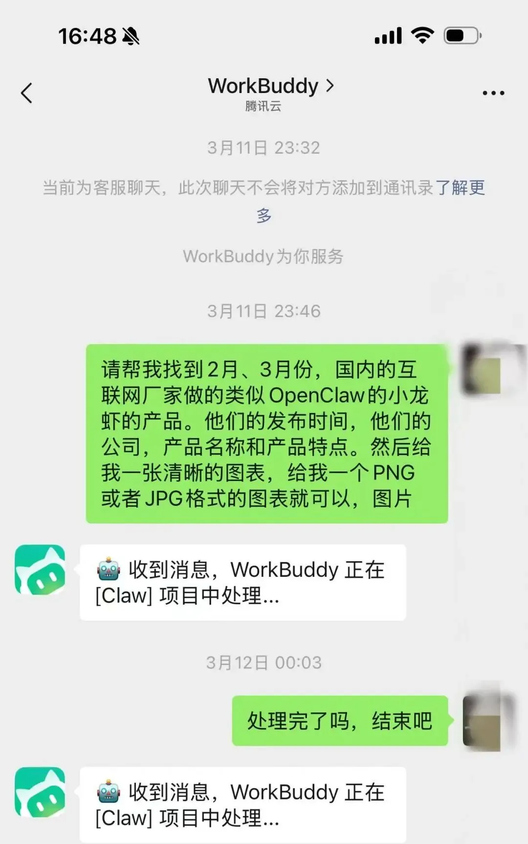 可以看到,我3月11日,就在微信【客服消息】里接入过腾讯云的龙虾——WorkBuddy,但这玩意儿,是真的不好用,我都懒得写文章介绍了。