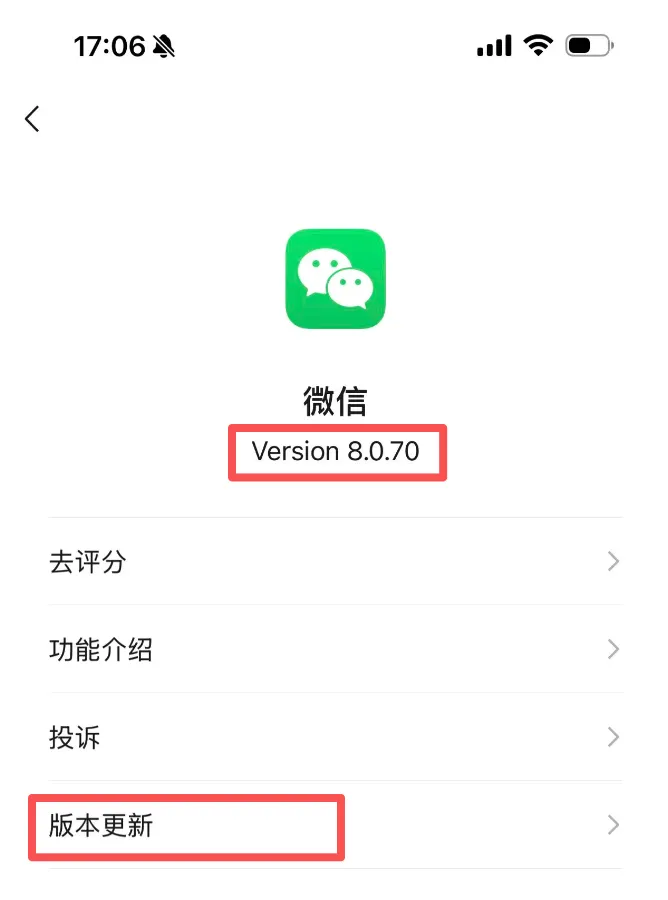 在【微信】-【我的】-【设置】-【关于微信】,检查版本是否为最新的8.0.70,如果不是就点击下方的【版本更新】,跳转到应用商店进行更新。