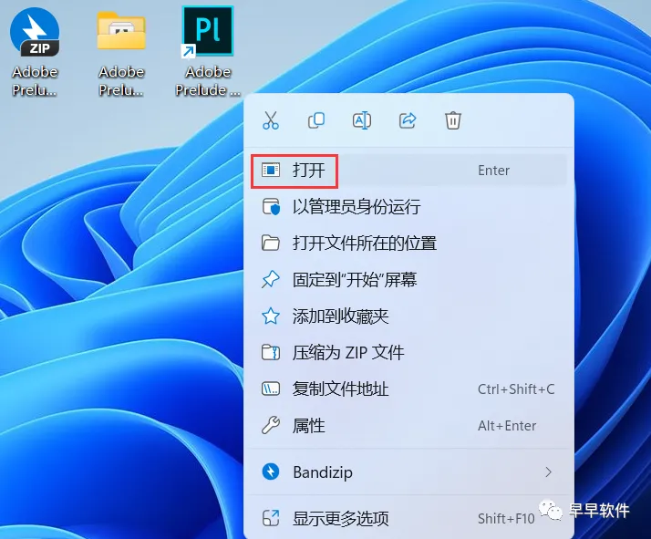 8、回到桌面,右键桌面上的【Adobe Prelude 2018软件图标】,点击【打开】