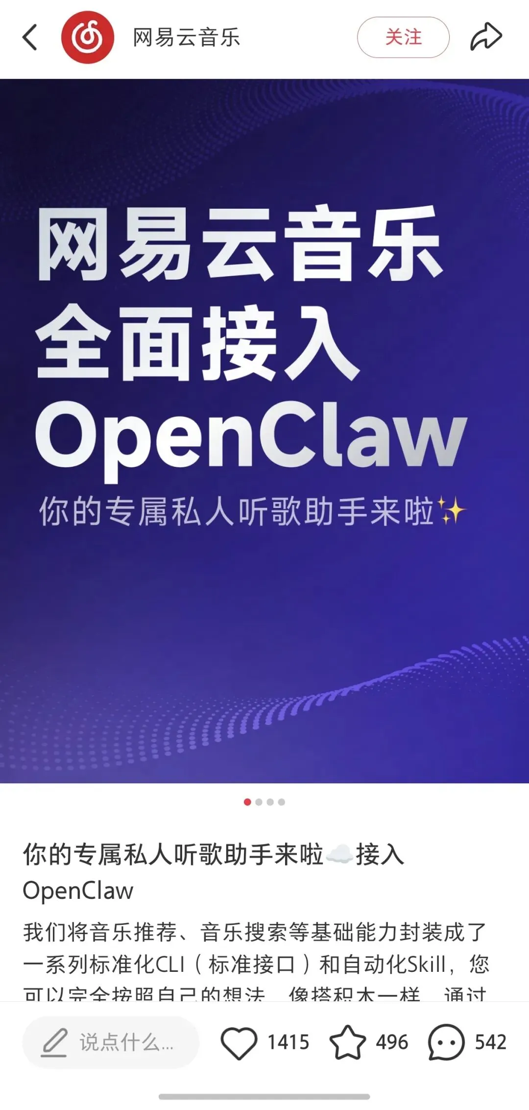 网易云音乐现已接入 OpenClaw,面向 AI Agent 开放音乐搜索、推荐等核心能力,还能直接完成搜歌、播放、暂停、切歌、调音量、查看状态等一整套操作