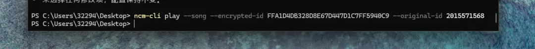 ncm-cli play --song --encrypted-id FFA1D4DB328D8E67D447D1C7FF5940C9 --original-id 2015571568