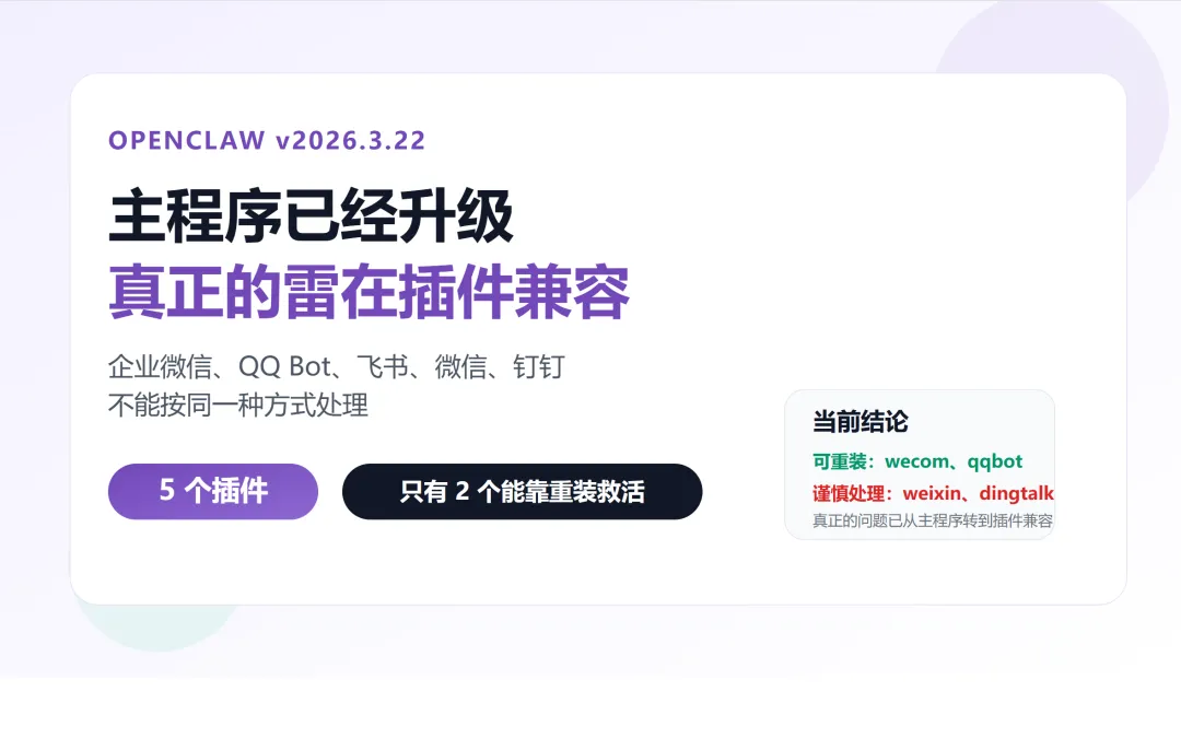 OpenClaw 到了 v2026.3.22 这一步,主程序升级已经不是最麻烦的事了。真正折磨人的,是插件兼容性开始分层。先保状态,再分流处理;先救得活的,再碰兼容性的。
