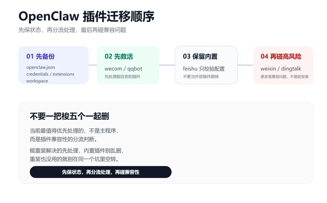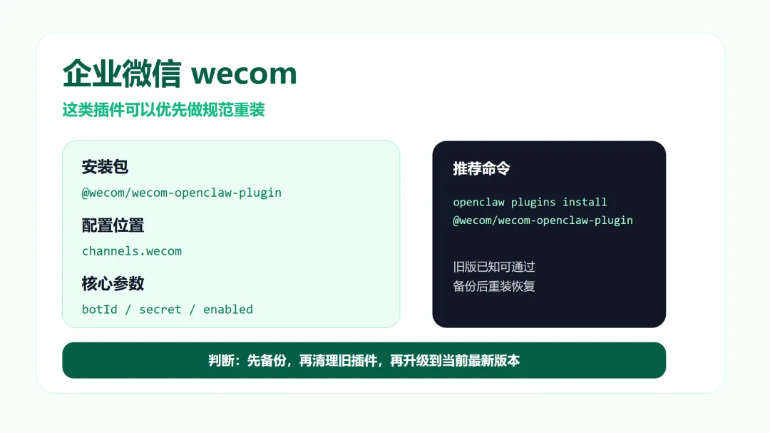 如果你当前环境里 wecom 还是旧版本,而 npm 最新已经明显往前走了,那它属于很典型的“可以通过规范重装恢复”的插件。先备份原配置,再清理旧插件,然后重装到当前最新。