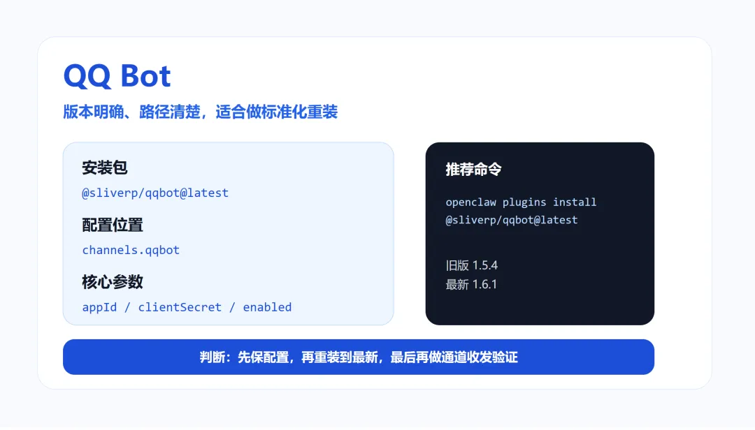 QQ Bot 对应插件是 @sliverp/qqbot@latest,配置位置在 channels.qqbot