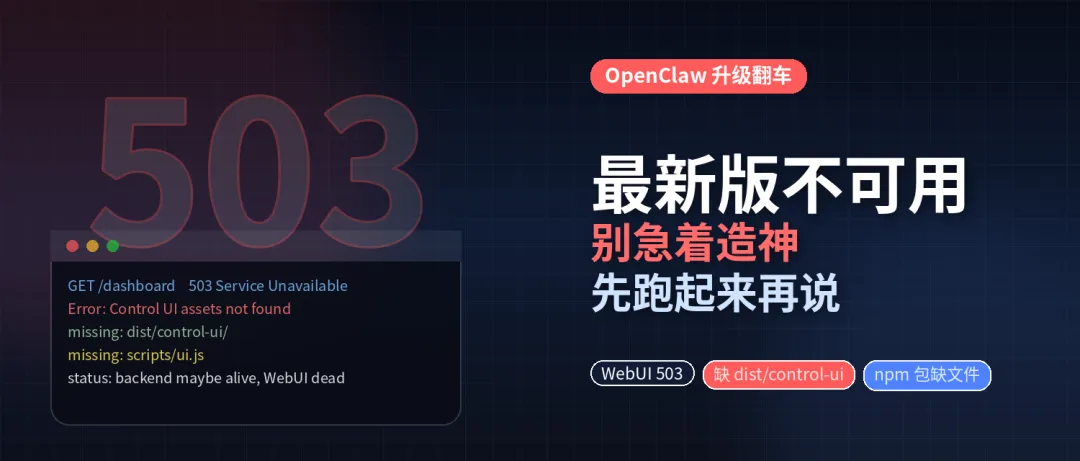 • v2026.3.22的 npm 包缺少dist/control-ui/• 结果就是 Web dashboard 无法访问 • 对 npm 安装用户来说,这是稳定可复现的问题