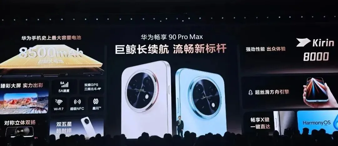 二, 本次发布的华为畅享90系列共有三款机型,首先是畅享90 Pro Max,配备了华为手机史上容量最大的8500mAh巨鲸大电池,同时搭载超级聚能泵和全域灵睿节电技术,超级聚能泵让电池容量释放率超过98%,全域灵睿节电技术让平均能效比提升12%。