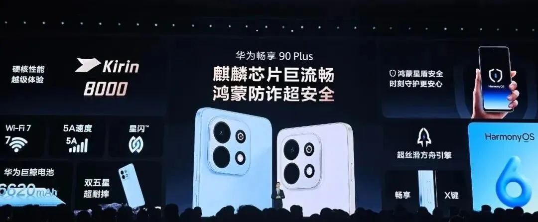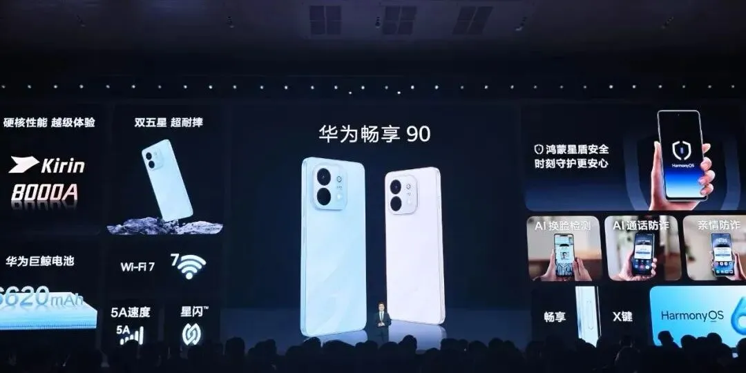 畅享90标准版核心配置为麒麟8000A芯片、HarmonyOS 6系统、6620mAh巨鲸电池,支持Wi-Fi 7、5A速度、星闪、鸿蒙星盾安全以及畅享X键。