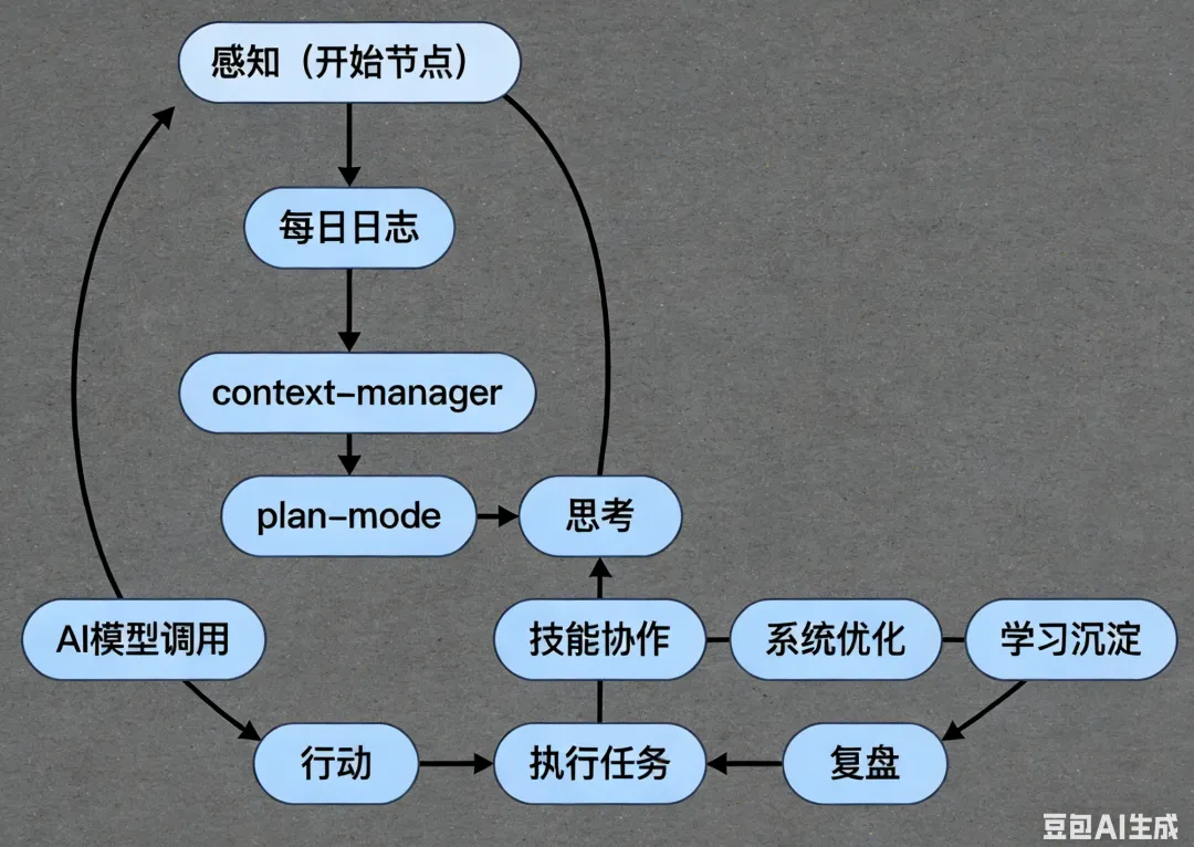 3. 底层:执行环境(行动层)技能组织好了,如何让它"动"起来,产生结果?答案就是:将我的每日日志和项目笔记,都视为技能调度的触发器和数据源,植入"感知→思考→行动→复盘"的完整循环。