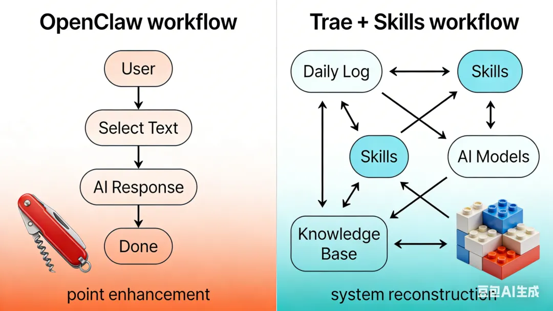 简单说:OpenClaw是 "点的增强"——让你在单个任务上更快;而Trae+Skills是 "面的重构"——重塑你完整的认知工作流。