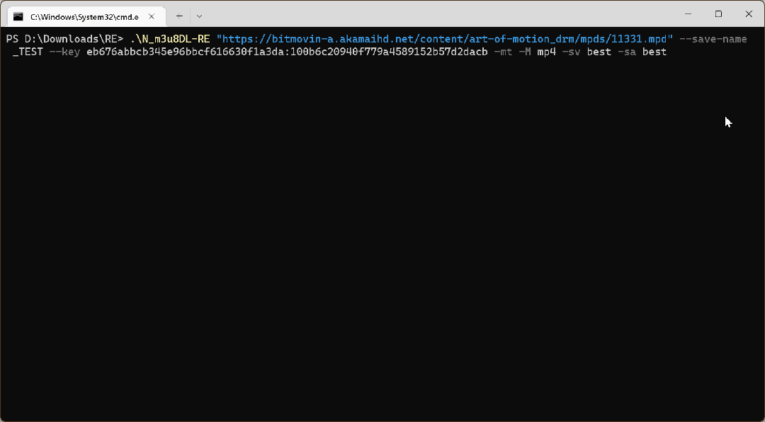 N_m3u8DL-RE "https://example.com/video.m3u8" \--key KID1:KEY1 \--decryption-engine SHAKA_PACKAGER
