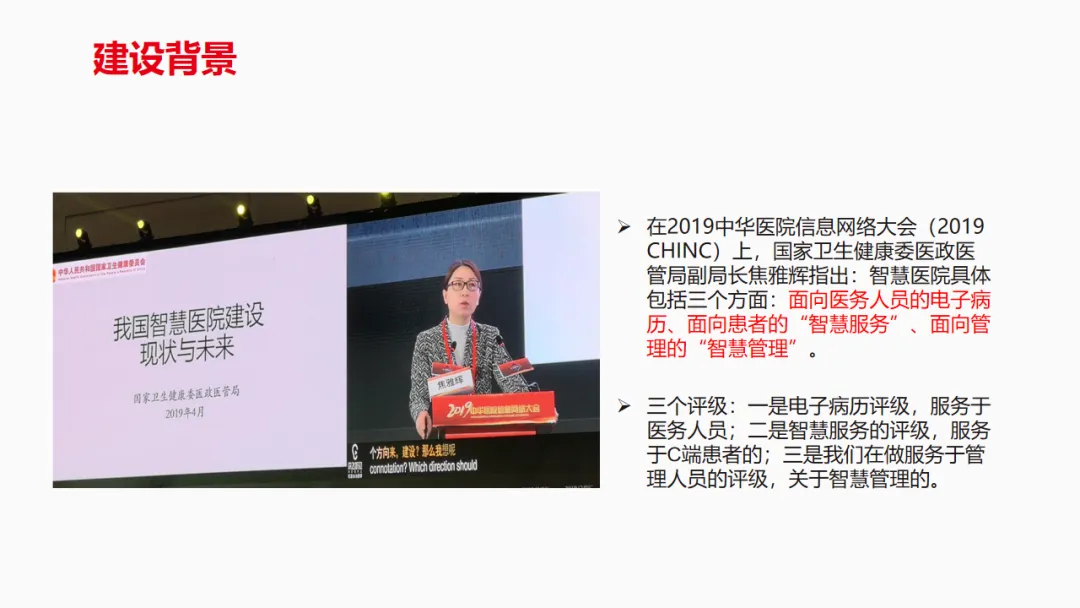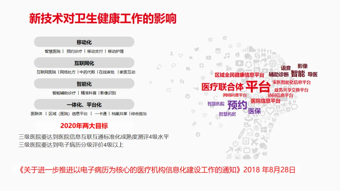 当前医疗行业正处于数字化转型关键期,国家明确智慧医院包含面向医务人员的电子病历、面向患者的智慧服务、面向管理的智慧管理三大核心板块,且要求 2020 年三级医院电子病历分级评价达 4 级以上、医院信息互联互通标准化成熟度测评达 4 级水平。行业现状呈现出医疗服务需提升便捷性、临床工作需提高效率、医院管理需实现精细化的核心需求,同时 5G、AI、物联网等新技术的落地,为智慧医院建设提供了技术支撑,也推动医疗服务向移动化、互联网化、智能化、一体化方向发展。