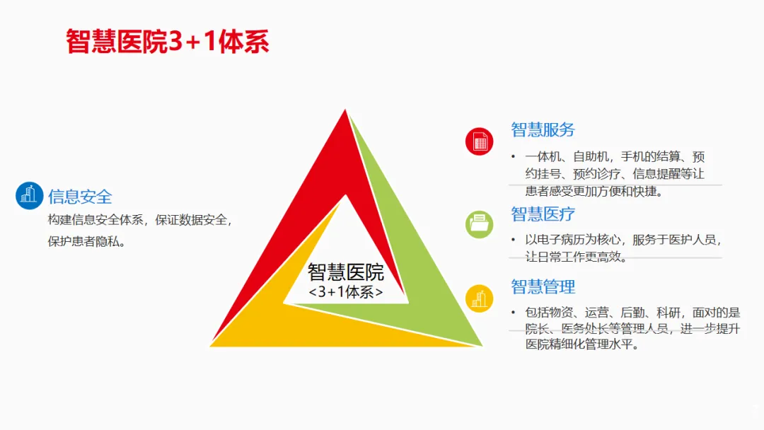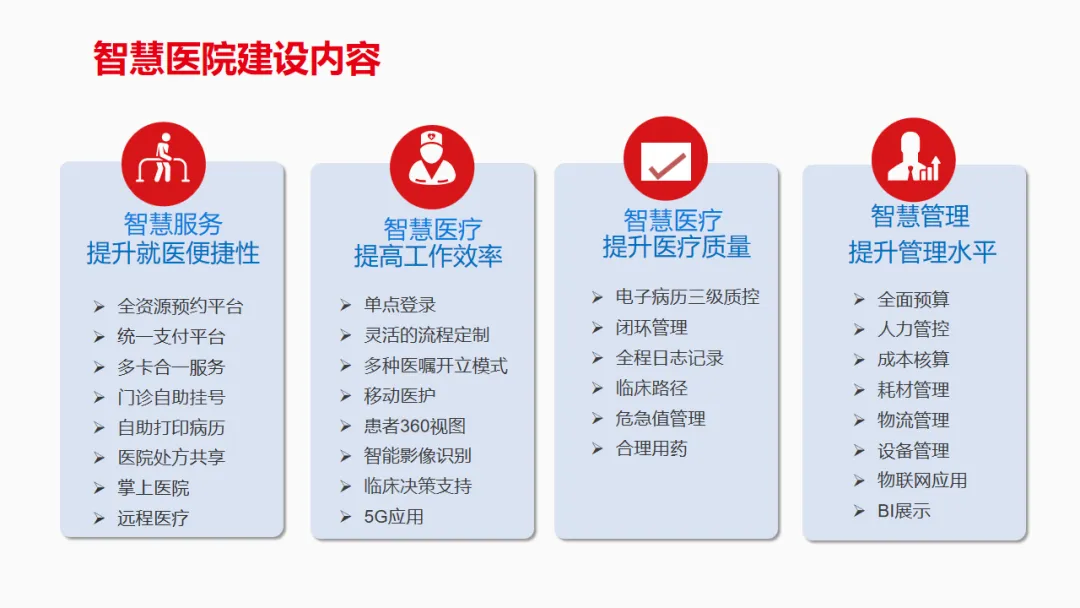 方案提出智慧医院建设以 “3+1” 体系为核心,即智慧医疗、智慧服务、智慧管理加信息安全保障,从就医、诊疗、管理多维度落地。智慧服务通过线上线下融合模式,实现预约挂号、诊间支付等全流程便捷服务,还推出智能机器人导诊、多卡合一等创新形式;智慧医疗依托电子病历、智能影像识别等技术,实现临床诊疗的智能化与高效化,其中智能病案管理特征识别准确率超 98%,危急值实时管控实现诊疗质量全流程把控;智慧管理则通过全成本核算、人力资源精细化管理、管理驾驶舱等,实现医院人财物的一体化管控,同时集团化医院可通过统一采购、预约、床位调度等中心,发挥规模优势,降低运营成本。