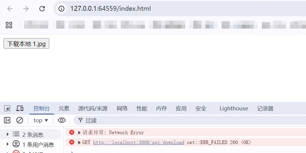✅ Network面板显示请求已发出 ✅ Timing显示下载持续了300ms+ ❌ 但响应数据"无法加载" ❌ 最终抛出 Network Error