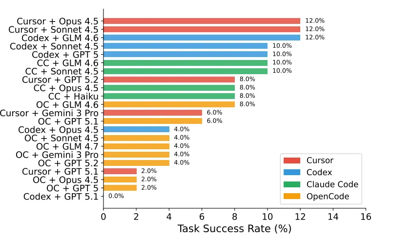 让我们戳破第一个泡泡:那些让你惊叹的演示,和你能做出的“生产级产品”之间,隔着一道名为“专业能力”的鸿沟。AI是专业能力的放大器,而非无中生有的魔法。用AI写出爆款文章的人,自己往往就是有一定公众号运营经验或者写作能力。他清楚观点、结构、节奏与读者痛点,AI只是他思想的打字机和修辞库。如果他自己思路混乱,AI产出的,只能得到的那种“正确的废话”——有形式,没灵魂。在更具技术性的领域,这道鸿沟更为明显。GitHub的数据显示,使用Copilot的开发者编码速度平均提升了55%,但对新人的帮助有限【1】。我们经常看到 OpenClaw 或更专业的 AI 编程工具(如 Codex、Claude Code、Cursor)能够完成日常的开发任务。这确实极大地降低了开发门槛、提升了开发效率,我自己也在使用,并时常惊叹于它带来的效率飞跃。任何有心人稍加学习,都能用它开发出可用程序。然而,当任务从“写一个可用程序” 升级为“生成或修改大型系统的生产级代码”时,情况就截然不同了。这需要深入的理解和适配——虽然门槛已降低很多,但面对真实复杂的需要考虑安全、网络和稳定的工程环境,依然需要开发者具备系统的知识和对业务上下文的把握。最极端的例子是根据小红书联合多伦多大学、加州大学伯克利分校等机构发布的 SWE-Bench Mobile 基准测试,在对生产环境真实的 iOS 代码库(14GB,含60万+行 Swift 和15万+行 Objective-C)进行的测试中,主流 AI 编程工具表现出了明显的局限性。其中,表现最好的 Cursor 配合 Claude Opus 4.5 组合,任务成功率仅为 12%;而在需要修改 7 个以上文件的复杂任务中,成功率更是暴跌至 2% 以下。失败的主要原因包括:无法理解企业级部署规范(如特性开关,占54%)、以及产生的 UI 与数据层逻辑脱节(占22%)等【9】。在创意领域更是如此。网上“十分钟用AI做动画”的教程遍地开花,但真正的AI动画制作是一个涉及故事板生成、角色绑定、口型同步、中间帧补全的复杂流程【2】。这背后,是分镜设计、镜头语言、审美把控、角色一致性维护等一系列专业创作能力。AI降低了“画笔”的门槛,也降低“导演”的门槛,但不足以让毫无经验的普通人可以轻松掌握。真相是:每一个炫酷的演示背后,都站着一个本就专业的人。他们贡献知识、经验与审美,AI贡献速度与想象力。AI让专业者的火把烧得更旺,但它无法为手中空无一物的人,凭空点燃火焰。做出产品,只是开始:运营与资源的残酷游戏