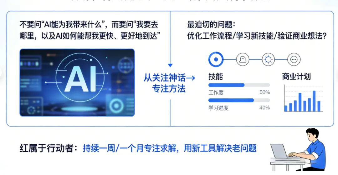 不要问“AI能为我带来什么”,而要问“我要去哪里,以及AI如何能帮我更快、更好地到达”。忘掉那些遥不可及的神话,回到你最迫切、最具体的问题:是优化一个工作流程,是学习一门新技能,还是验证一个商业想法?