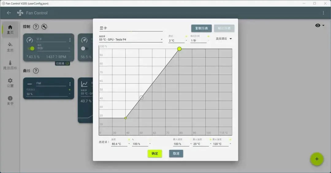 然后我以显卡为例,传感器选择 Tesla P4 ,配置一下风扇转速和温度的曲线,然后点击确定即可: